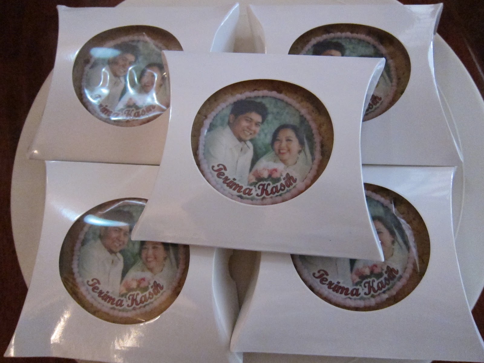 These chocolate chip cookies are decorated with edible image of the bride and groom, individually sealed and boxed. They are given out as wedding favors.